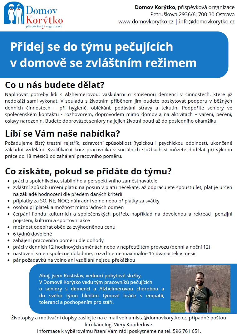 - napište na mail: volnamista (@) domovkorytko.cz, nebo poštou k rukám personalisty organizace Ing. Viery Konderlové (tel. kontakt pro bližší informace: 596 761 651)